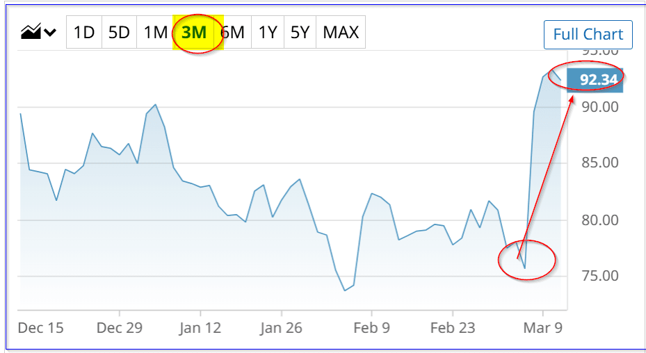 MRVL is at $91.05today, down from a recent peak, but up sharply after its after-market close earnings release on March 5. On that day, MRVL closed at $75.68, so it's still up +20% in the last week.